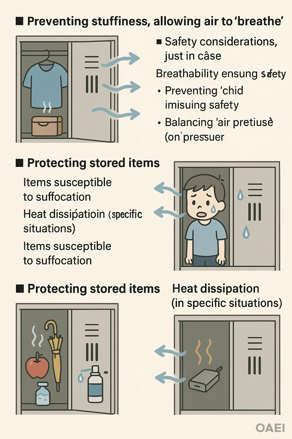 Forebyggelse af "sved": I koldt vejr er temperaturen inde i skabet høj (f.eks. fra opbevaring af varme genstande), mens udetemperaturen er lav, hvilket forårsager, at der dannes kondens på indervæggene (som "sved" på ydersiden af en kop). Ventilationshuller hjælper med at balancere temperatur og fugtighed, reducerer denne "sved" og beskytter bøger, dokumenter eller fugtfølsomme genstande gemt indeni.